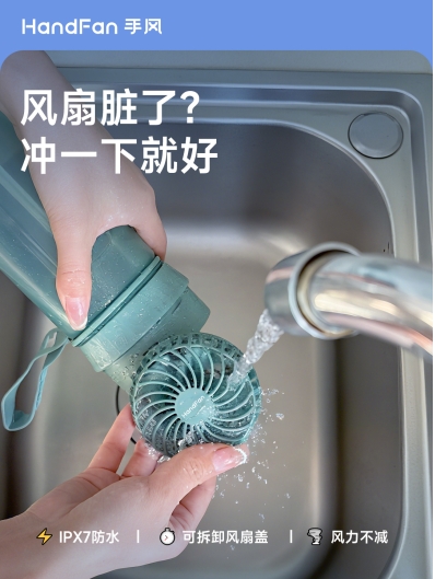 开风扇3天就积灰?真相在这风扇高速旋转时,叶片与空气摩擦会产生静电就像冬天脱毛衣时的“噼啪”声一样这些静电会吸住空气中的灰尘/棉絮/毛发等微小颗粒时间久了,叶片就会变脏风力变小还容易滋生细菌!懒人救星来啦!可以水洗的手风风扇水杯脏了直接冲!3秒焕新不是梦~IPX7防水:整机可在水龙头下冲洗可拆卸设计:风扇盖边边角角都能洗干净5.2m/s大风力:体感直降5℃超凉快喝水+吹风二合一的神仙单品再也不怕静